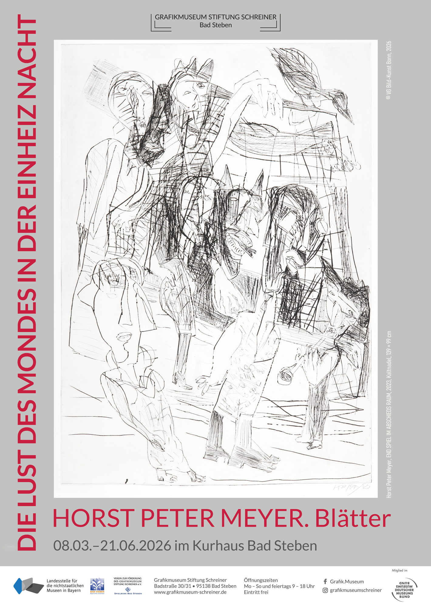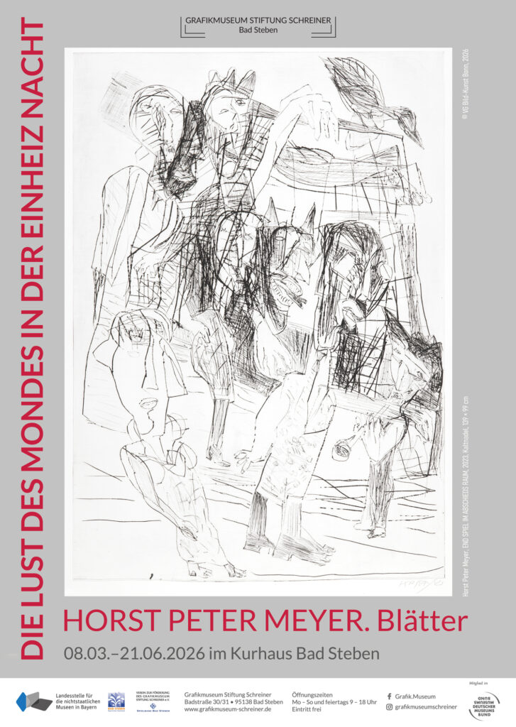Horst Peter Meyer (* 1947) aus Weimar in Thüringen, der an der Hochschule für Bildende Künste Dresden studierte, ist eine der wichtigsten und auch kritischsten Stimmen der Gegenwartskunst Mitteldeutschlands. 2024 erhielt der Künstler für seine monumentale Kaltnadel END SPIEL IM ABSCHIEDS RAUM (2023) den von Stefanie Barbara Schreiner initiierten und gestifteten »Wolfgang Schreiner-Stiftungspreis für Druckgrafik« des Grafikmuseum Stiftung Schreiner, der mittlerweile zum zweiten Male im Rahmen der Leipziger Grafikbörse für herausragende Leistungen auf dem Gebiet der zeitgenössischen Druckgrafik am 22. November 2024 verliehen wurde. Unsere Schau DIE LUST DES MONDES IN DER EINHEIZ NACHT. Horst Peter Meyer. Blätter | ›Wolfgang Schreiner-Stiftungspreis für Druckgrafik‹ 2024 vereint die für Horst Peter Meyer charakteristischen Kaltnadeln mit seinen eher selten gezeigten oder bislang vollkommen unbekannten Holzschnitten, Linolschnitten und Lithografien. Nutzen Sie also diese besondere Gelegenheit.